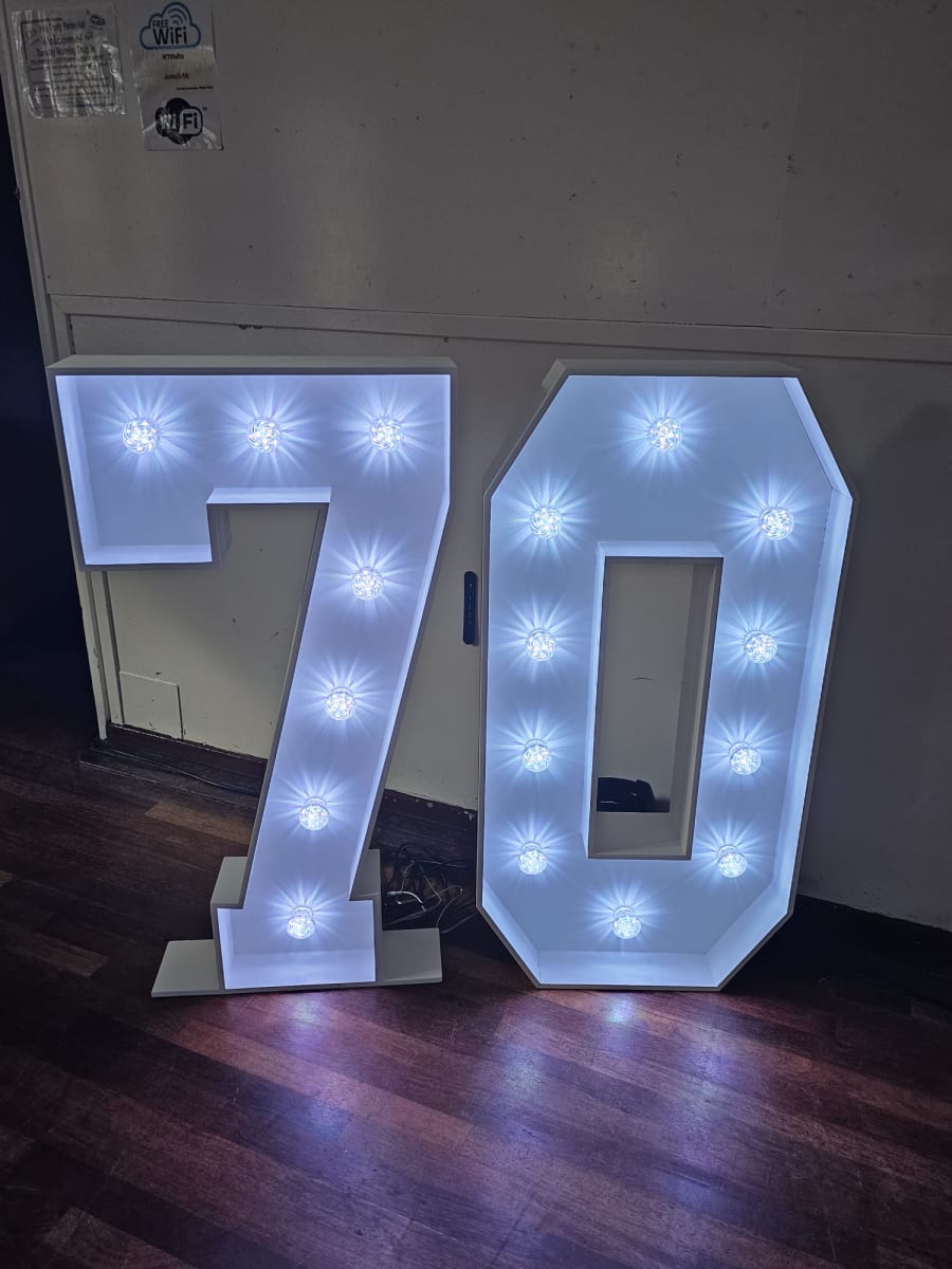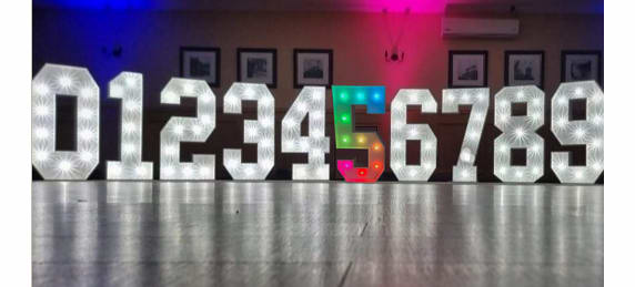 Numbers 0-9 and a love heart. White numbers all lights can be in white or different light up colours depending on your party colour theme.